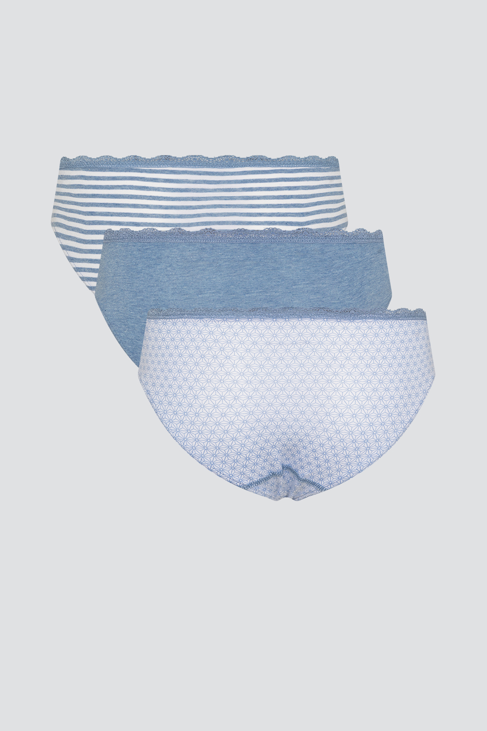 Einfach wohlfühlen mit unserem bequemen Mini-Slip im praktischen 3er Pack. Die unterschiedlichen Designs kreieren verschiedene Looks, welche Abwechslung für jeden Tag bieten und garantiert immer die perfekte Wahl sind – langweilig wird es daher nie. Der softe Baumwoll-Mix ist angenehm auf der Haut und bietet höchsten Tragekomfort in jeglichen Situationen. Das absolute Highlight sind die dekorative Gummispitze am Bund und die Schleife vorne am Bund.