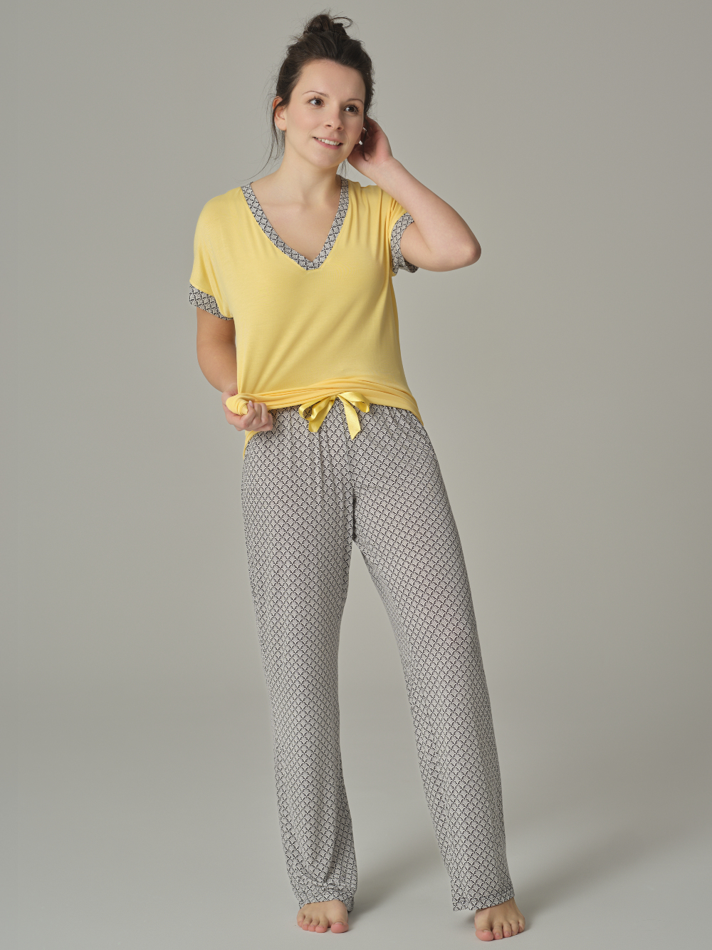 Diese lange Hose vereint Komfort und Stil. Der weich fließende Stoff bietet ein leichtes, angenehmes Tragegefühl und passt sich dank des Elasthan-Anteils perfekt an die Körperform an. Mit einem elastischen Bund und einer dekorativen Schleife wird nicht nur für einen bequemen Sitz gesorgt, sondern auch ein modisches Detail hinzugefügt. Die dezente Musterung verleiht der Hose einen eleganten Look, der sich ideal zum Entspannen oder für gemütliche Tage zu Hause eignet. Ein Must-have für alle, die auf der Suche nach bequemer, aber stilvoller Loungewear sind.